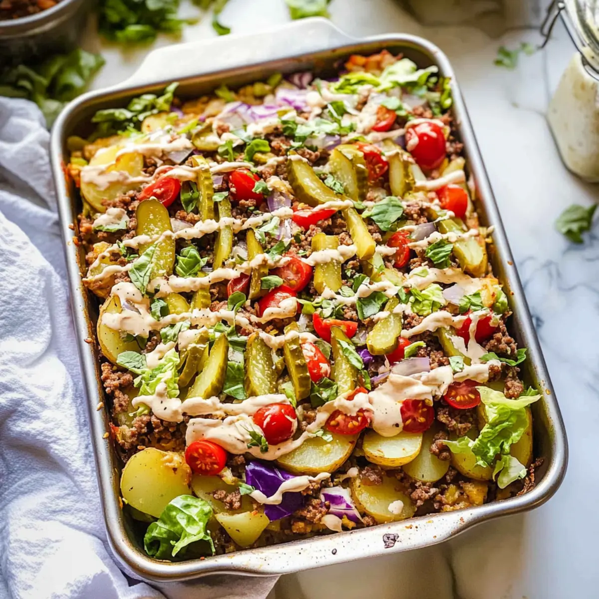 The Big Mac Casserole is gluten-free when using tamari instead of regular soy sauce and can be adjusted for various dietary needs. You could substitute ground beef with turkey for a leaner option, and swap cheese for dairy-free varieties if needed. Always check product labels for specific allergens, especially for Hummus and condiments.