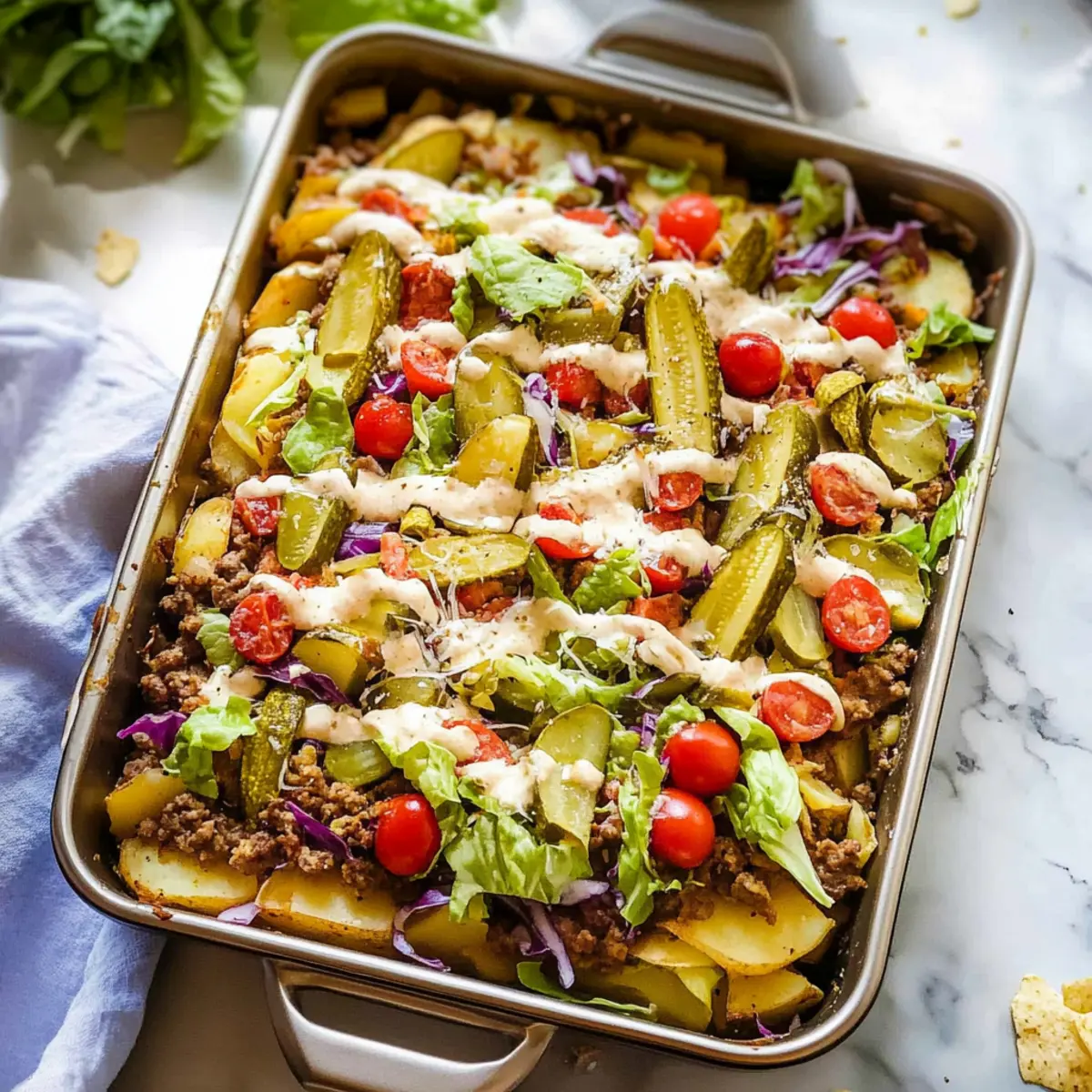 Once out of the oven, let the casserole cool for about 5 minutes. While it cools, chop up your fresh toppings like lettuce, cherry tomatoes, and dill pickle chips. This allows you to enhance your Big Mac Casserole with a burst of freshness right before serving.