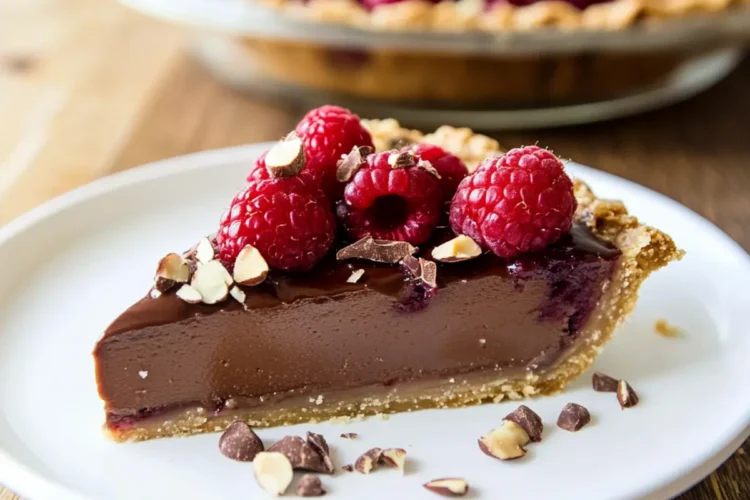 To serve, take the Chocolate Hazelnut Pie out of the freezer and let it sit for about 5 minutes for easier slicing. Top each slice with a generous drizzle of raspberry sauce and a few fresh raspberries for extra color. Store any leftovers tightly covered in the freezer, where they will keep for up to 1 month, making this a simple yet impressive dessert that’s always ready to share.