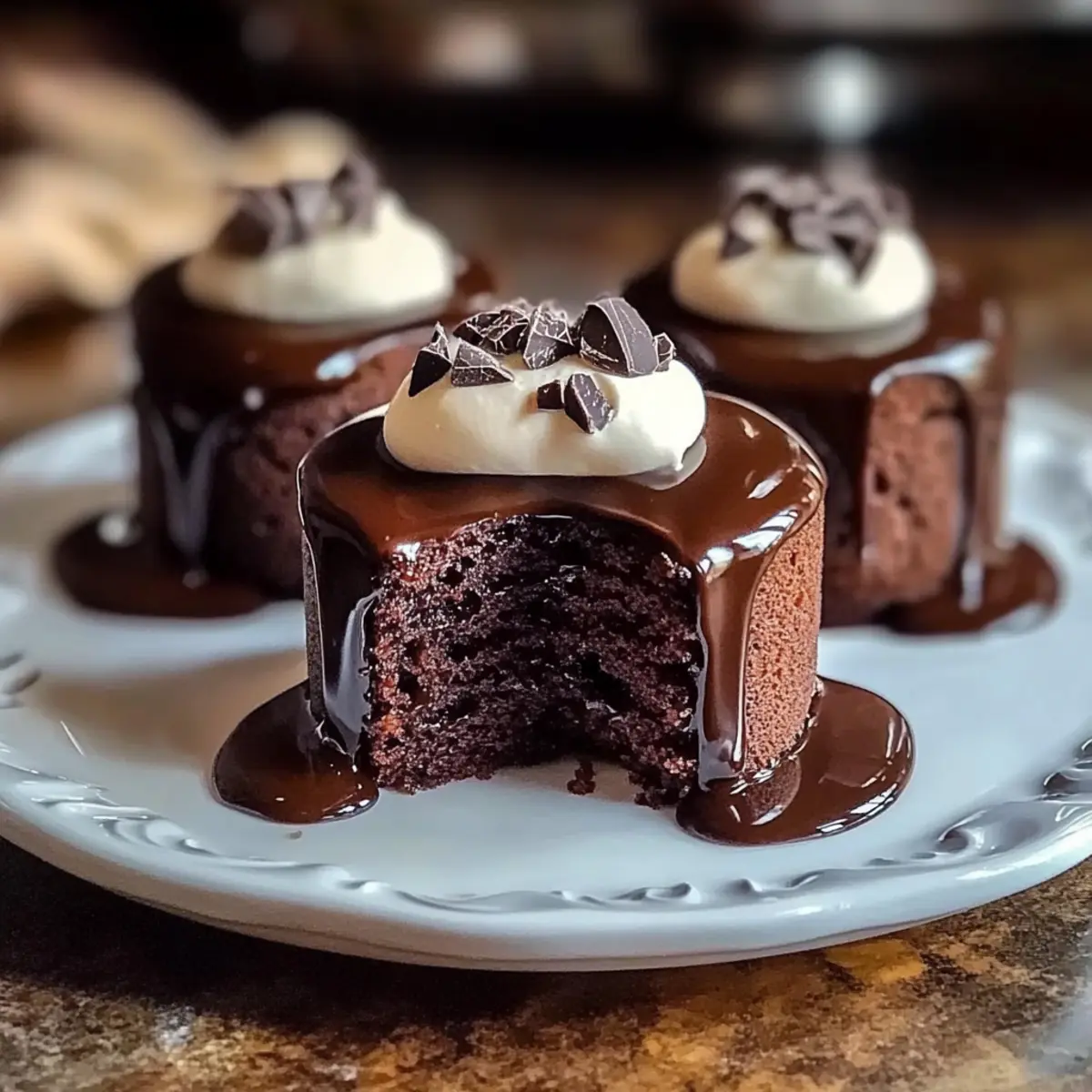 Once the cakes are completely cool, slice each mini cake horizontally to create layers. Spread the whipped cream filling between the layers, then top each with a generous drizzle of the chocolate ganache. This layering process adds texture and flavor, making each bite irresistibly delicious.