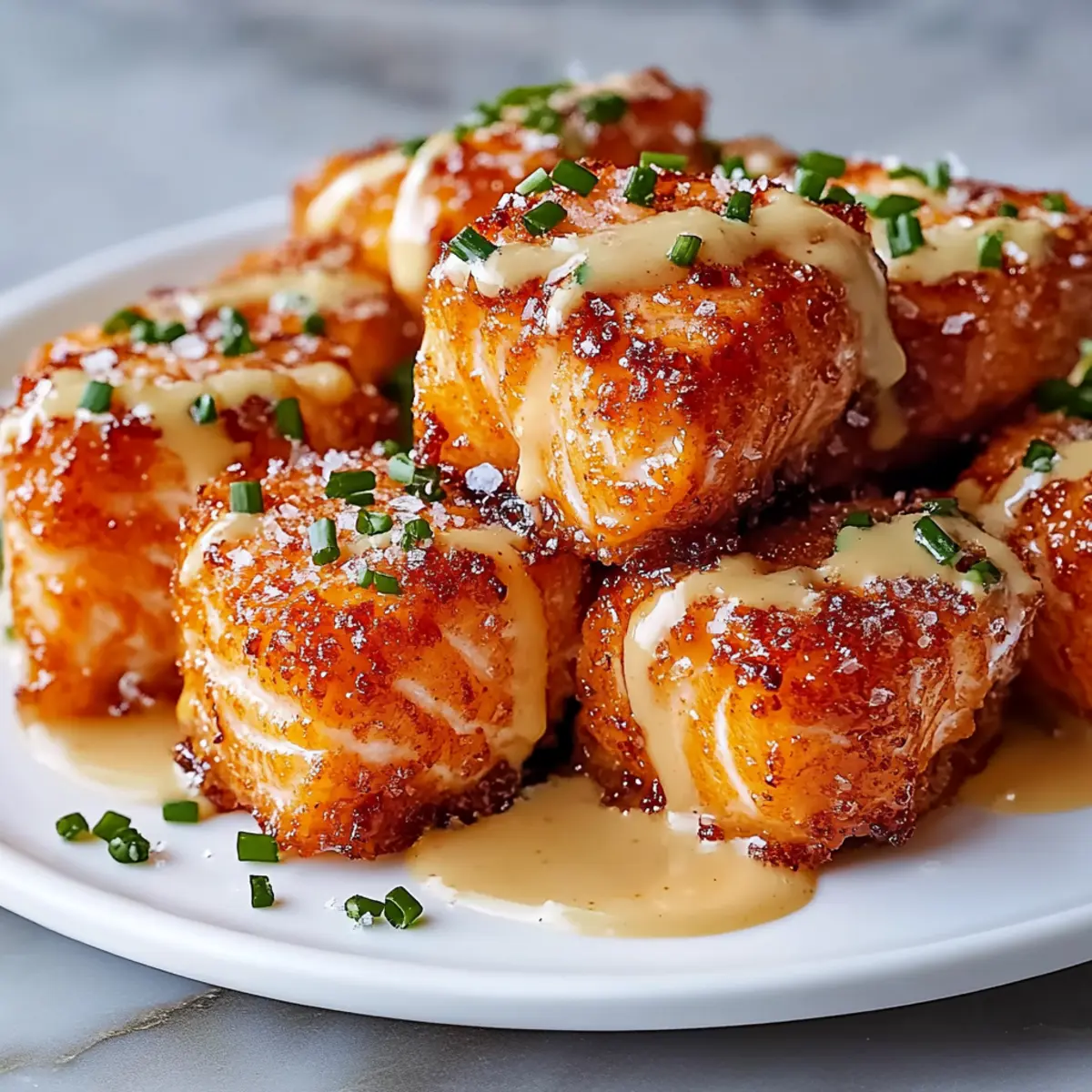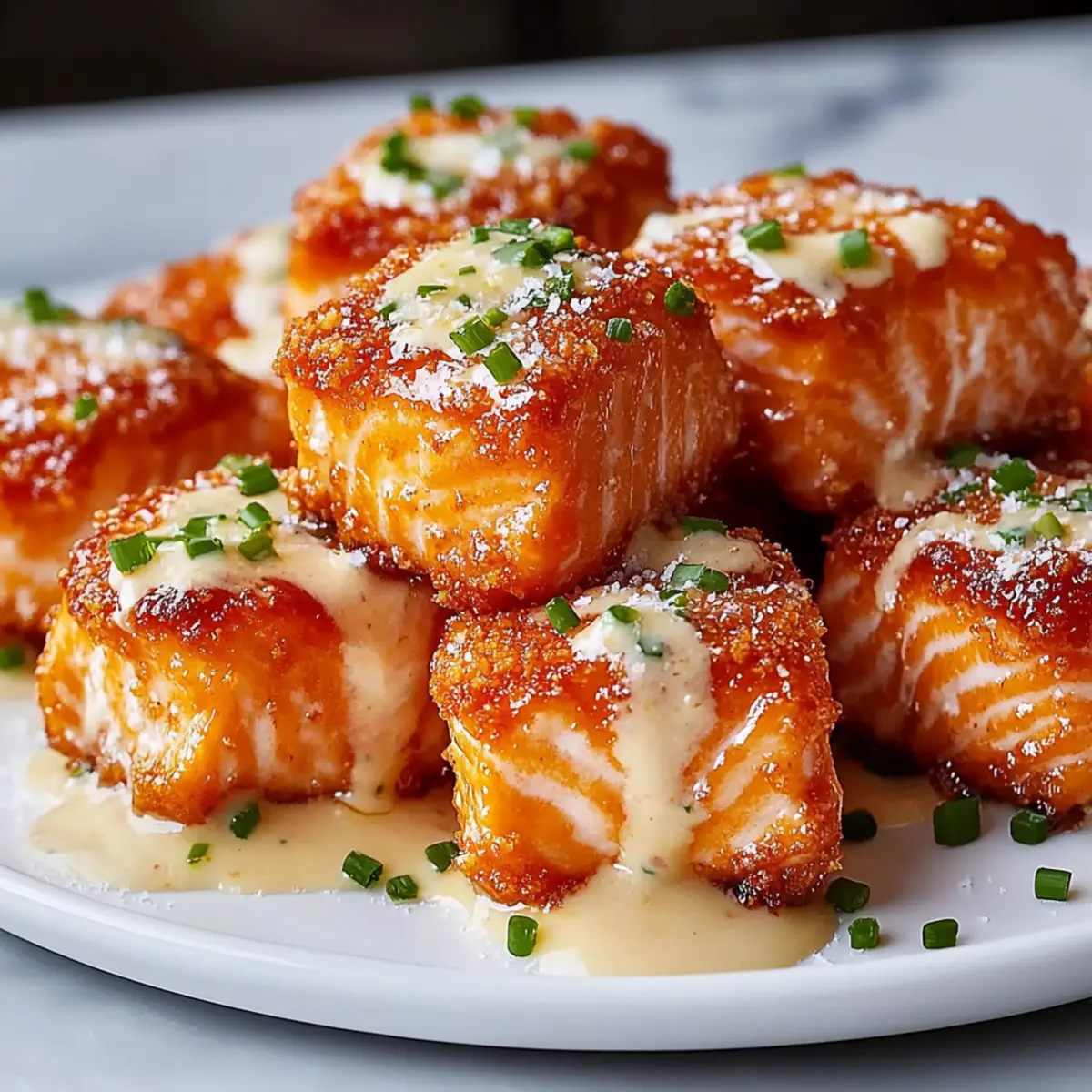 Once all the salmon bites are golden and crispy, remove them from the skillet and drain on paper towels. Drizzle or toss the hot salmon bites in the Bang Bang sauce, letting them absorb the flavors. Garnish with chopped chives or grated Parmesan for added color and flavor before serving warm.
