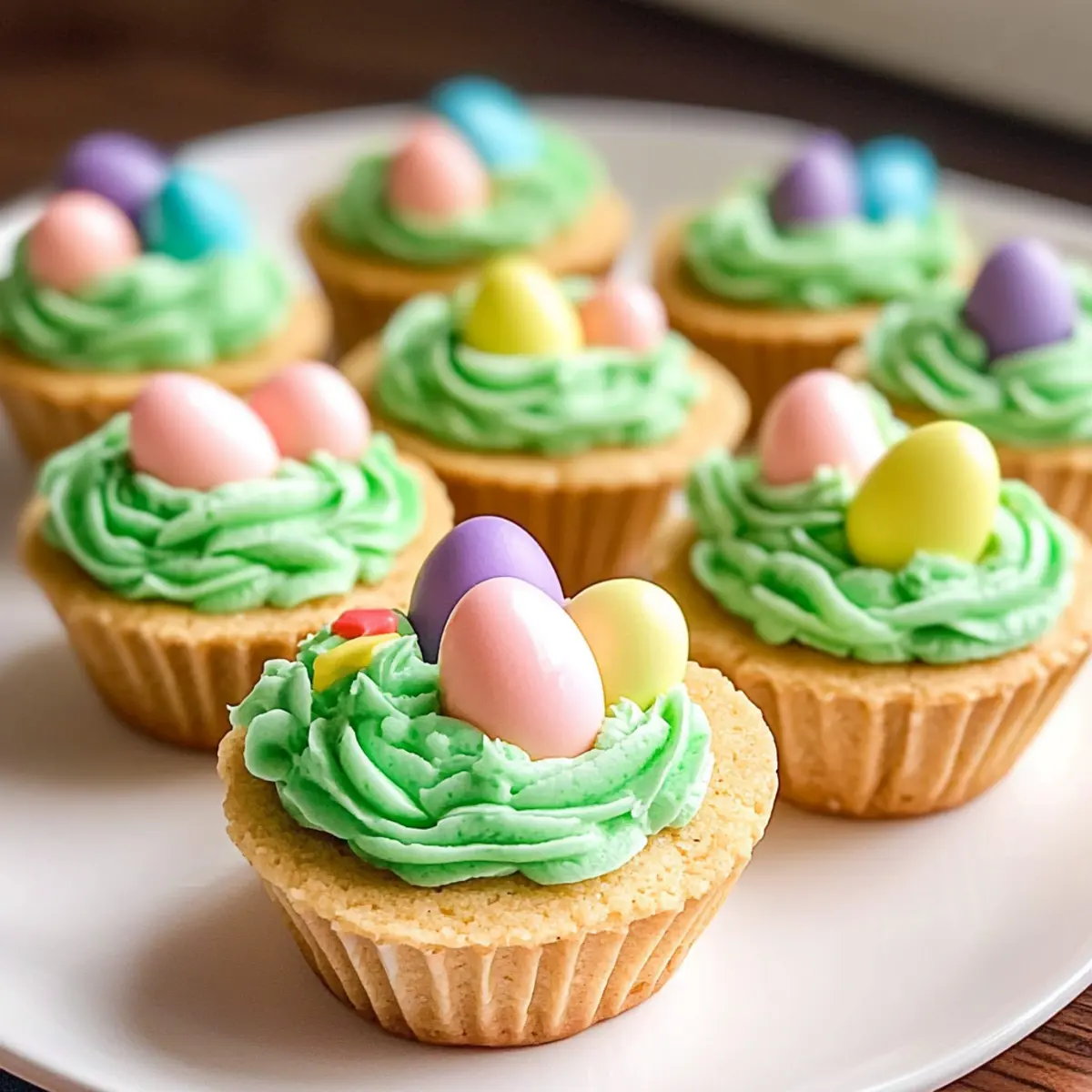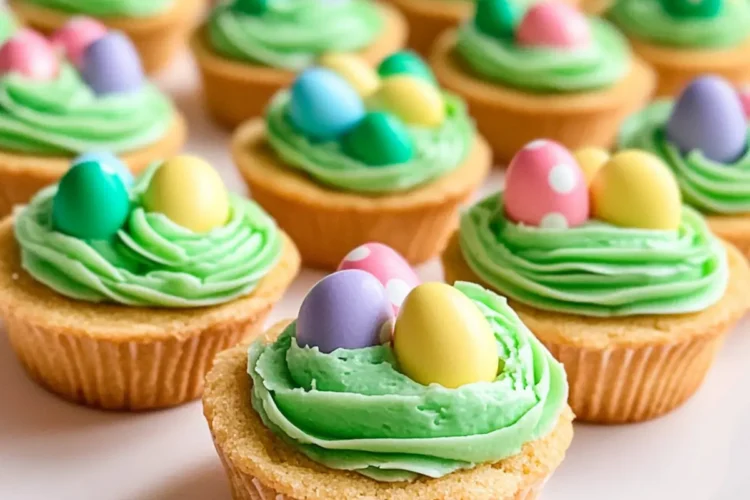 Finally, it’s time to add the finishing touches to your Easter Basket Sugar Cookie Cups! Top each frosted cup with a few Hershey’s Egg Candies or any colorful chocolates of your choice. Arrange them whimsically within the grass-like frosting to mimic a festive Easter basket full of treats, making these cookie cups a real showstopper!