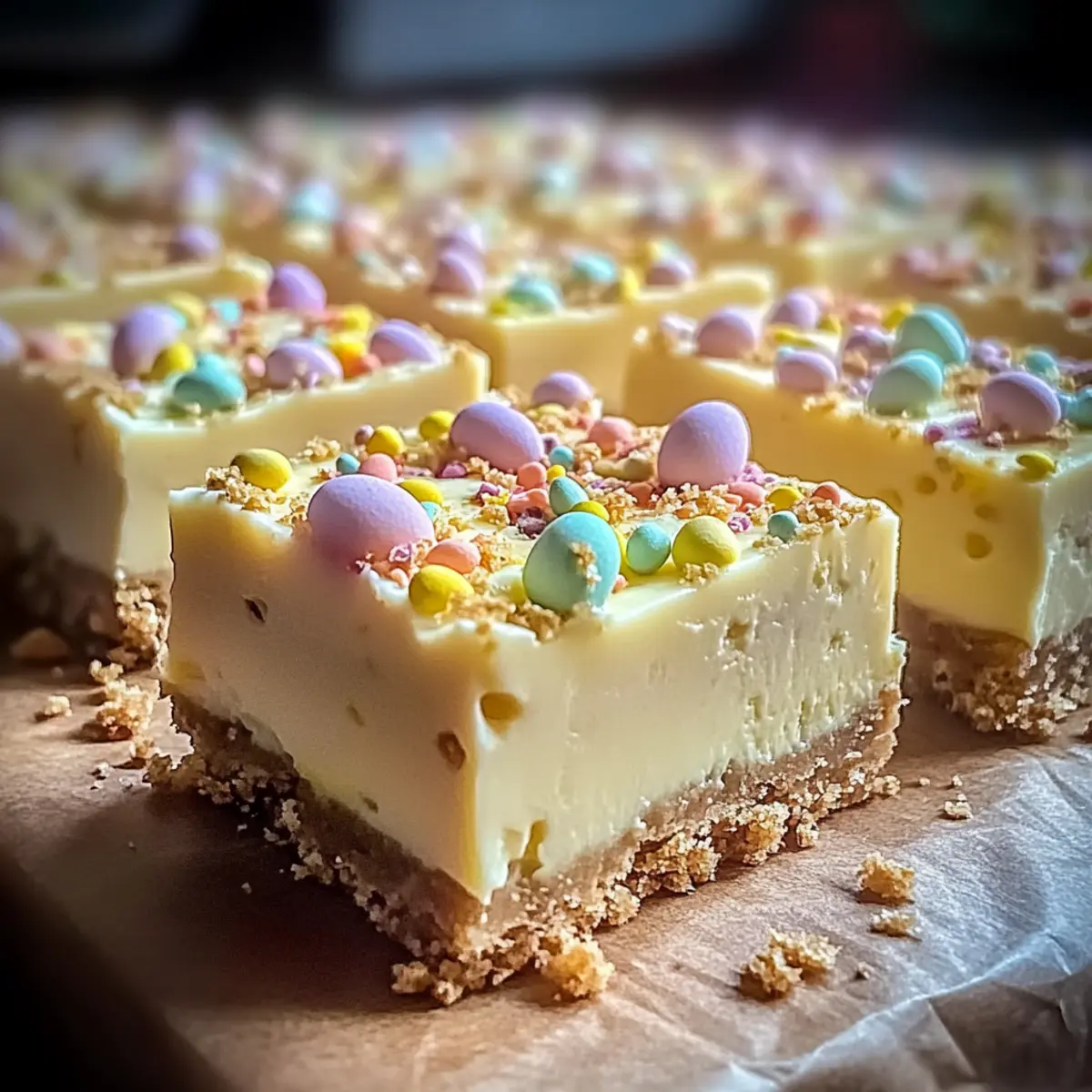 Refrigerate the cheesecake for at least 2 hours or preferably overnight to achieve the perfect texture. Once chilled, remove the bars from the pan and cut them into squares. Decorate the top with colorful mini Easter egg candies and finish with a light dusting of powdered sugar for a festive touch.
