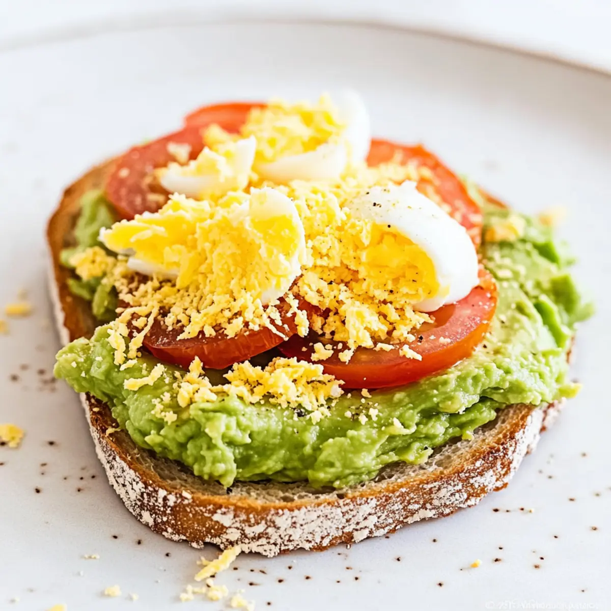 Next, take your chilled hard-boiled egg and grate it using a box grater or microplane over the avocado and tomato layers. Cover the toast evenly with the fluffy grated egg, creating a rich layer that acts as a satisfying protein boost on your Grated Egg Avocado Toast.