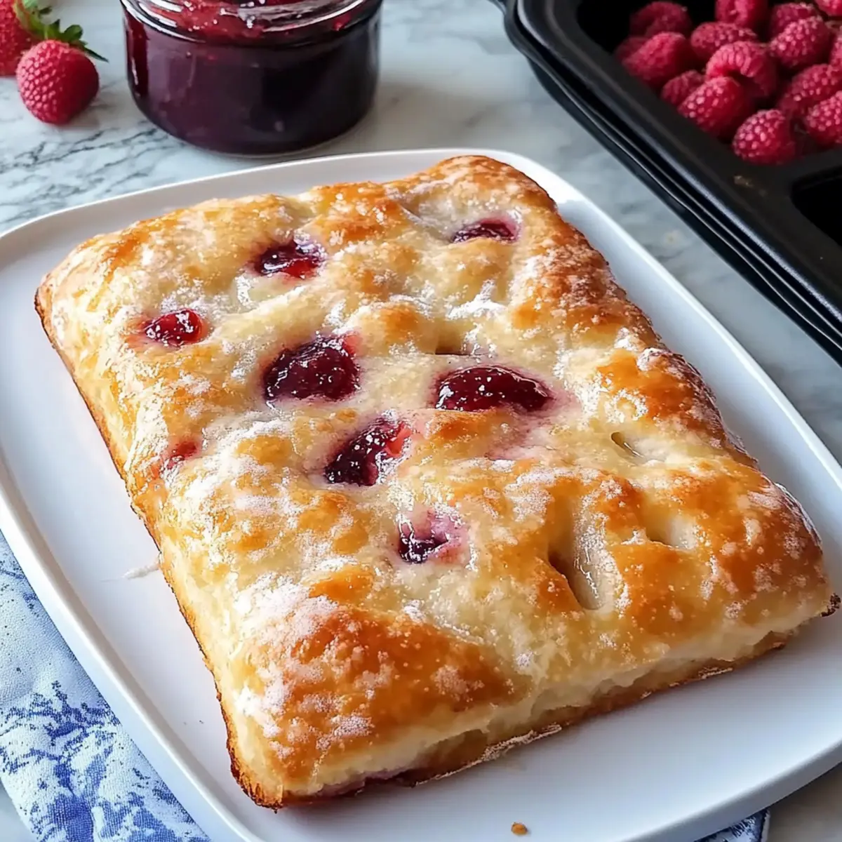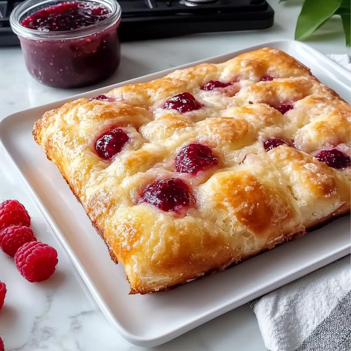 - Prepare for Baking: Pour olive oil over the dough and create dimples. Spread raspberry preserves in the dimples.