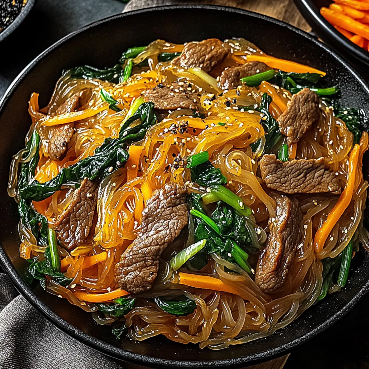- Korean sweet potato noodles (glass noodles) – The star ingredient offering a chewy texture; ensure to soak them according to package instructions.