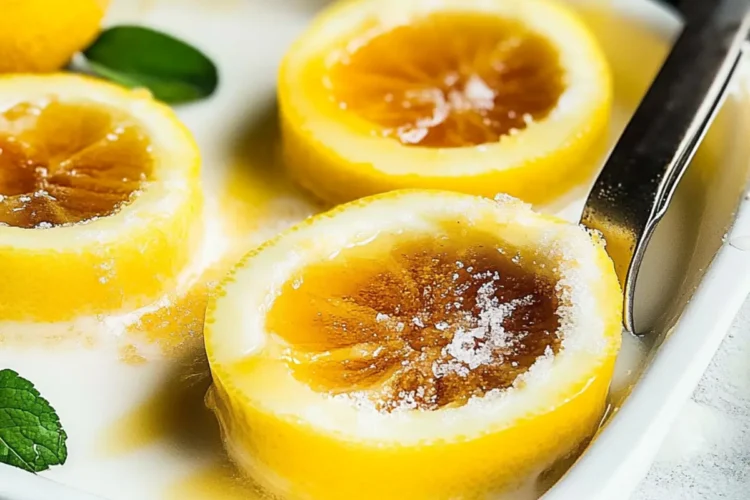 When ready to serve, remove the lemon halves from the fridge and sprinkle a thin layer of granulated sugar on top of each. Use a kitchen torch to melt the sugar evenly, moving the flame across the surface until it caramelizes to a beautiful golden brown. This should only take about 1-2 minutes.