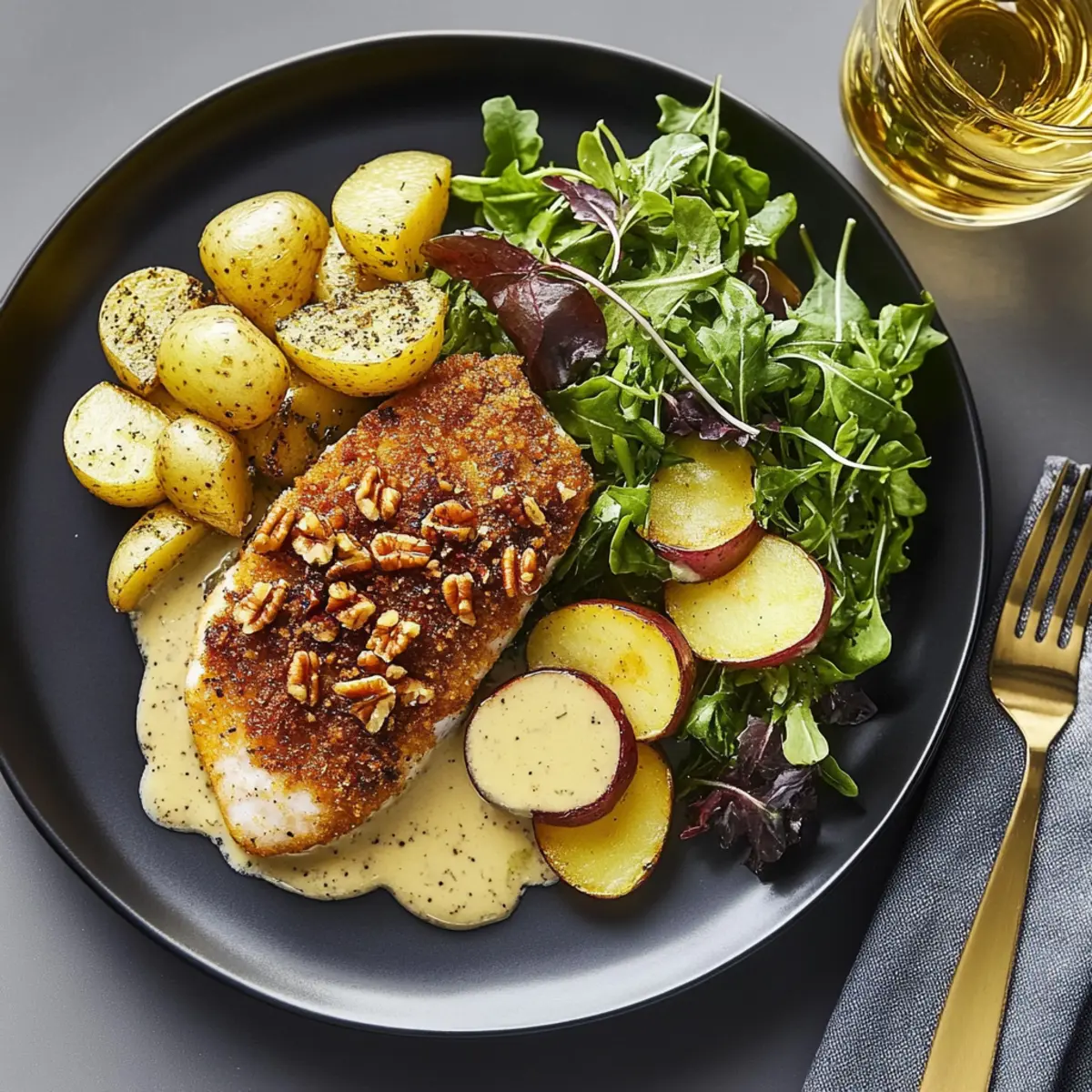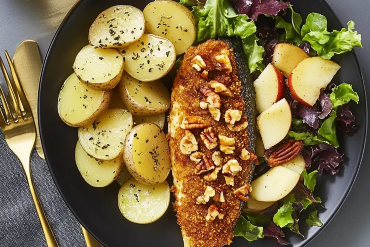 Once everything is cooked to perfection, take the trout and roasted potatoes out of the oven. Plate the pecan-crusted trout alongside the thyme-roasted potatoes and a generous serving of the apple-studded salad. Drizzle any leftover honey mustard sauce over the trout for a delightful finish and enjoy your exquisite Pecan-Crusted Trout dinner!