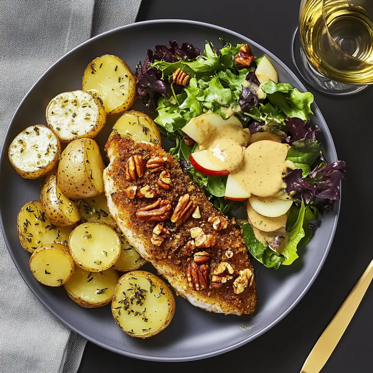 Balanced Meal in One Plate: Featuring thyme-roasted potatoes and a fresh, apple-studded salad, this dish achieves that sought-after mix of textures and flavors, pleasing every palate.
