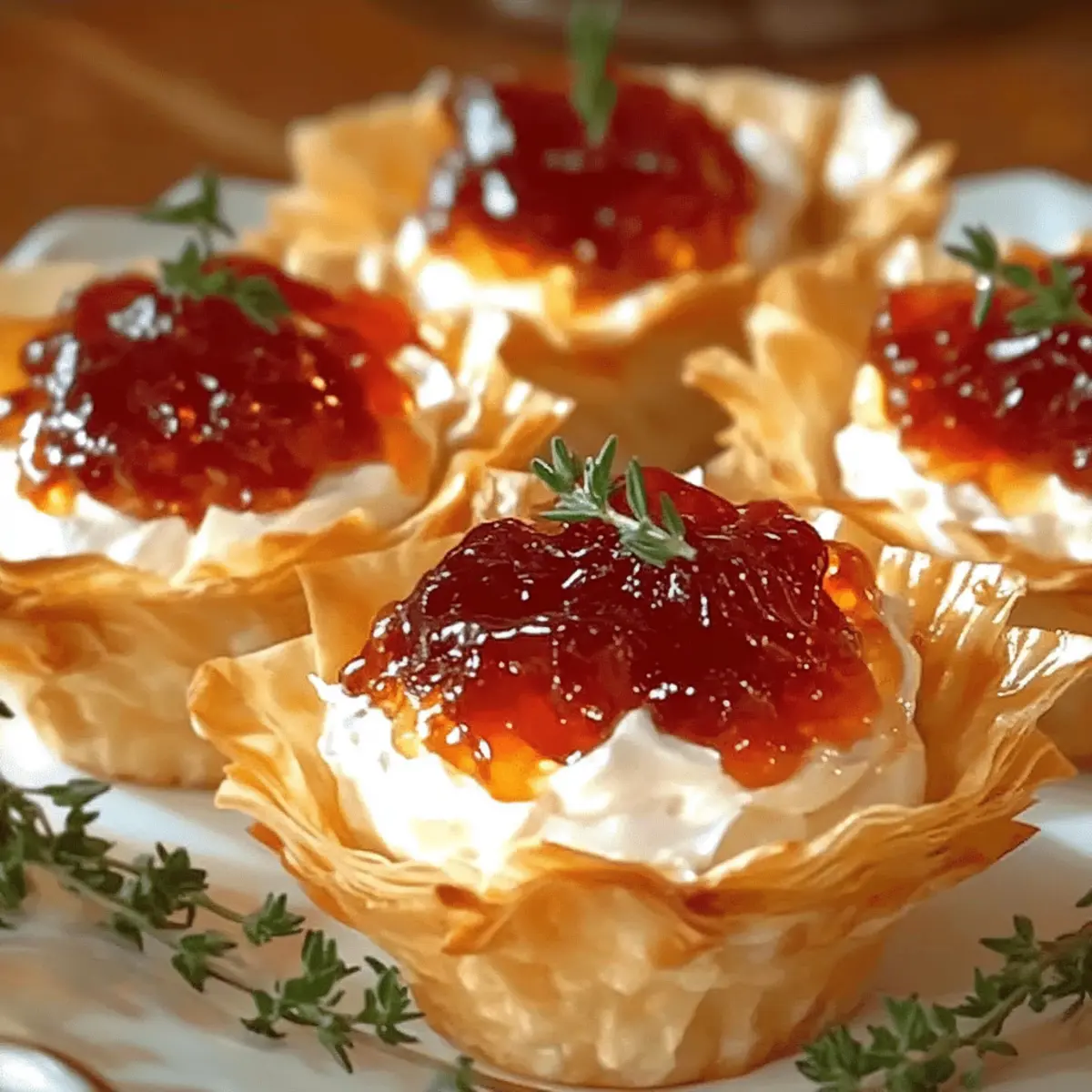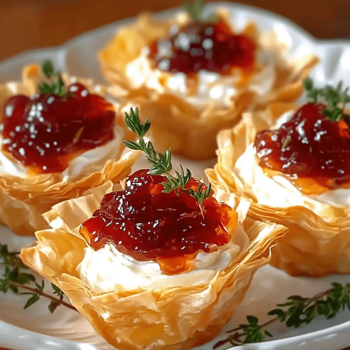 Once baked, remove the phyllo bites from the oven and let them cool slightly. For an extra touch, sprinkle fresh thyme or chopped green onion on top for garnish. This final step not only adds freshness but also elevates the presentation. Serve the Quick Pepper Jelly Cream Cheese bites warm or at room temperature, delighting your guests with each flavorful piece!