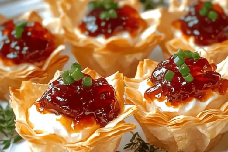 - Bake for 5–7 minutes until the phyllo shells are crisp and cream cheese is warm.