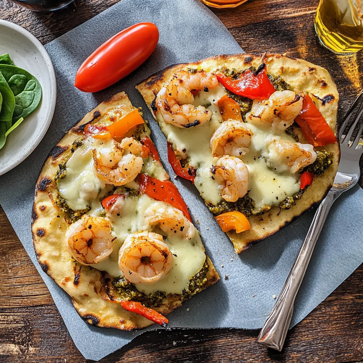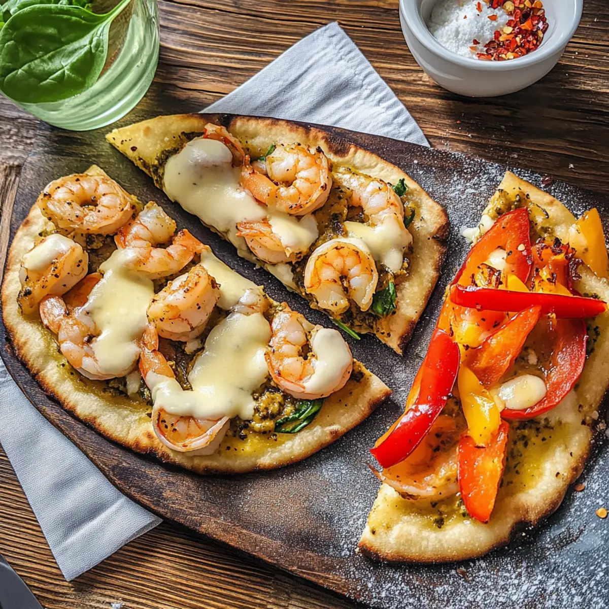- Spread pesto mixture on each naan, layer cooked shrimp, sautéed bell peppers, and sprinkle shredded mozzarella. Add chili flakes on top.