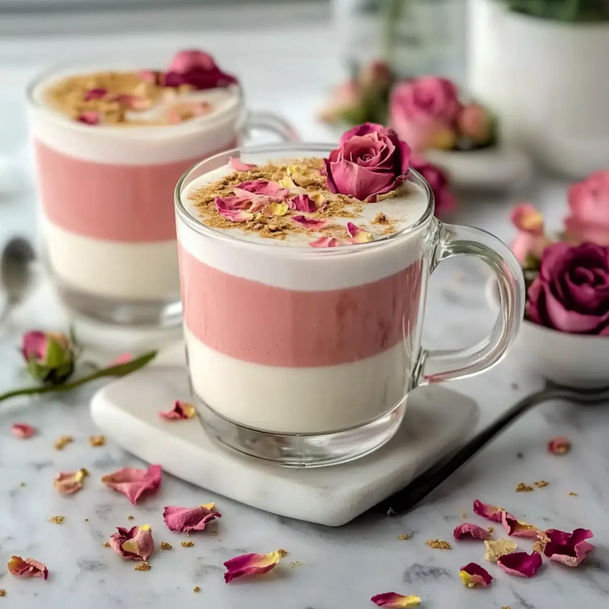 - Prepare Rose Vanilla Syrup: In a saucepan over medium heat, combine 1 cup of water, 1 cup of sugar, and 1/4 cup of dried rose petals. Stir until the sugar dissolves and let it steep for 20-30 minutes. Strain the syrup.