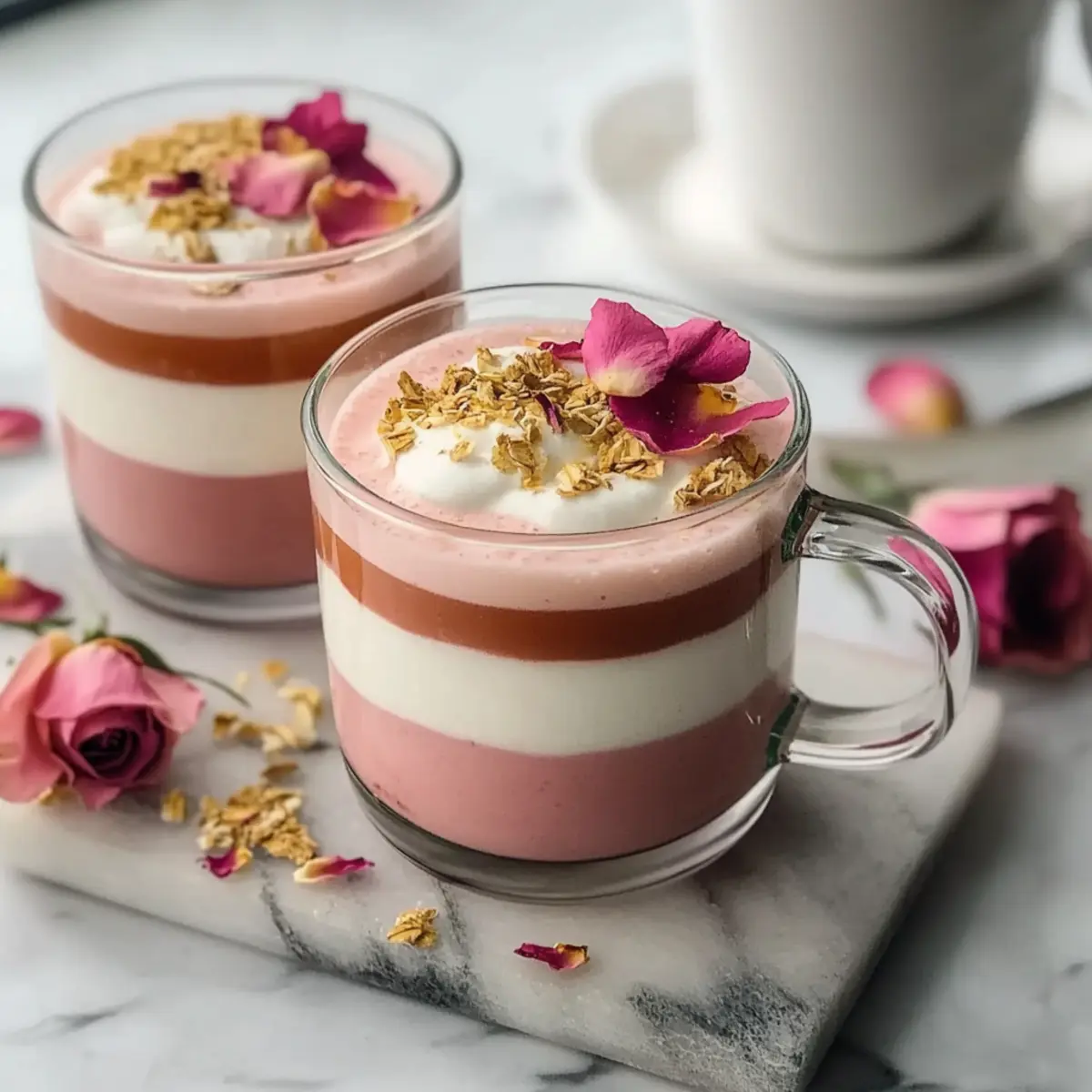 - Combine and Serve: Pour the frothed oat milk over the sweetened tea, garnish with dried rose petals or additional rose syrup if desired.
