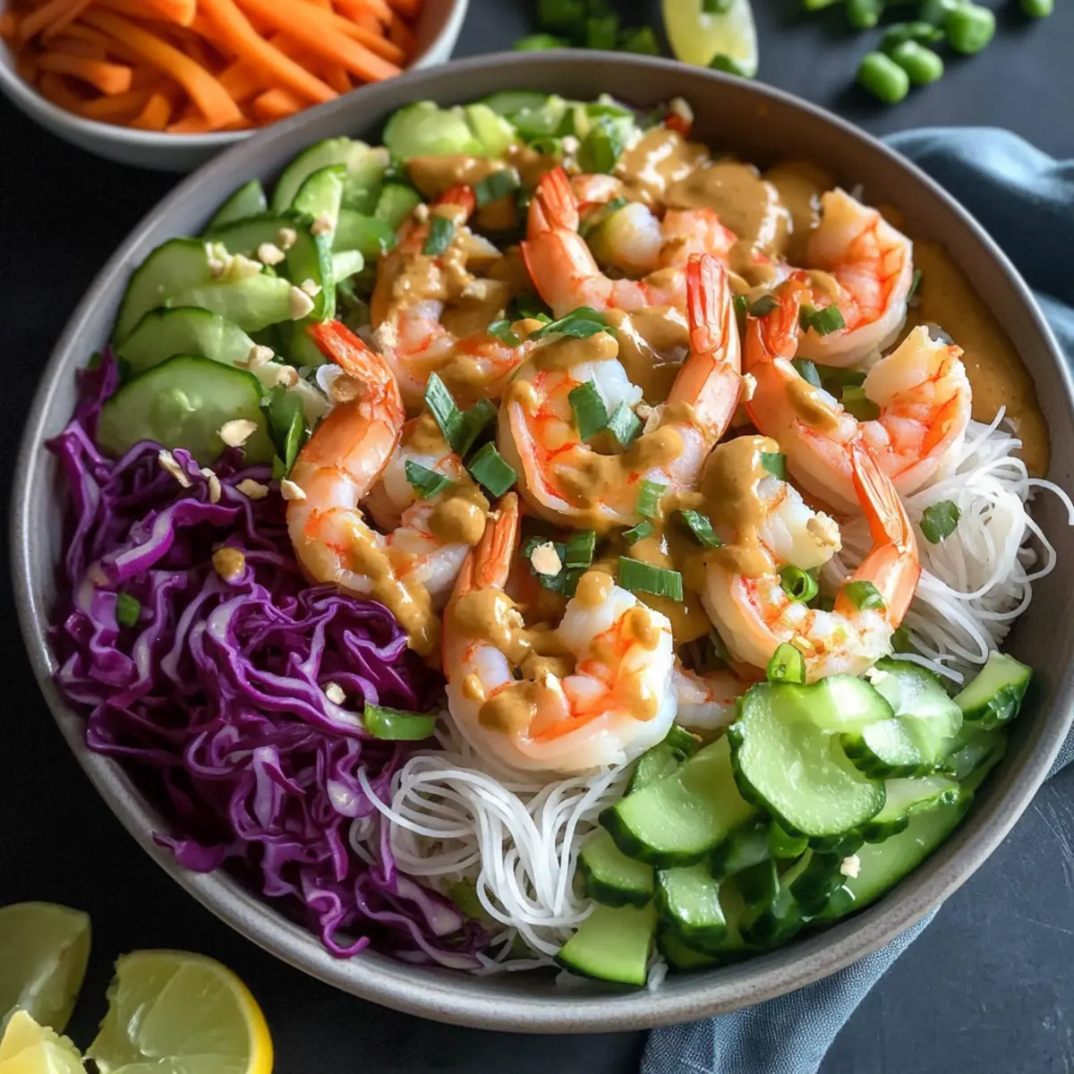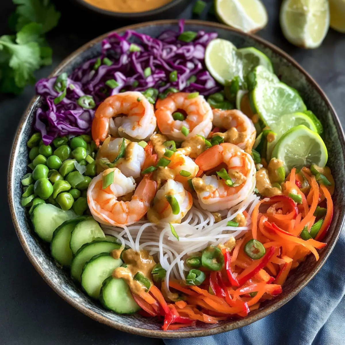 - Assemble bowls by dividing noodles, topping with shrimp and vegetables, and drizzling with peanut dressing.