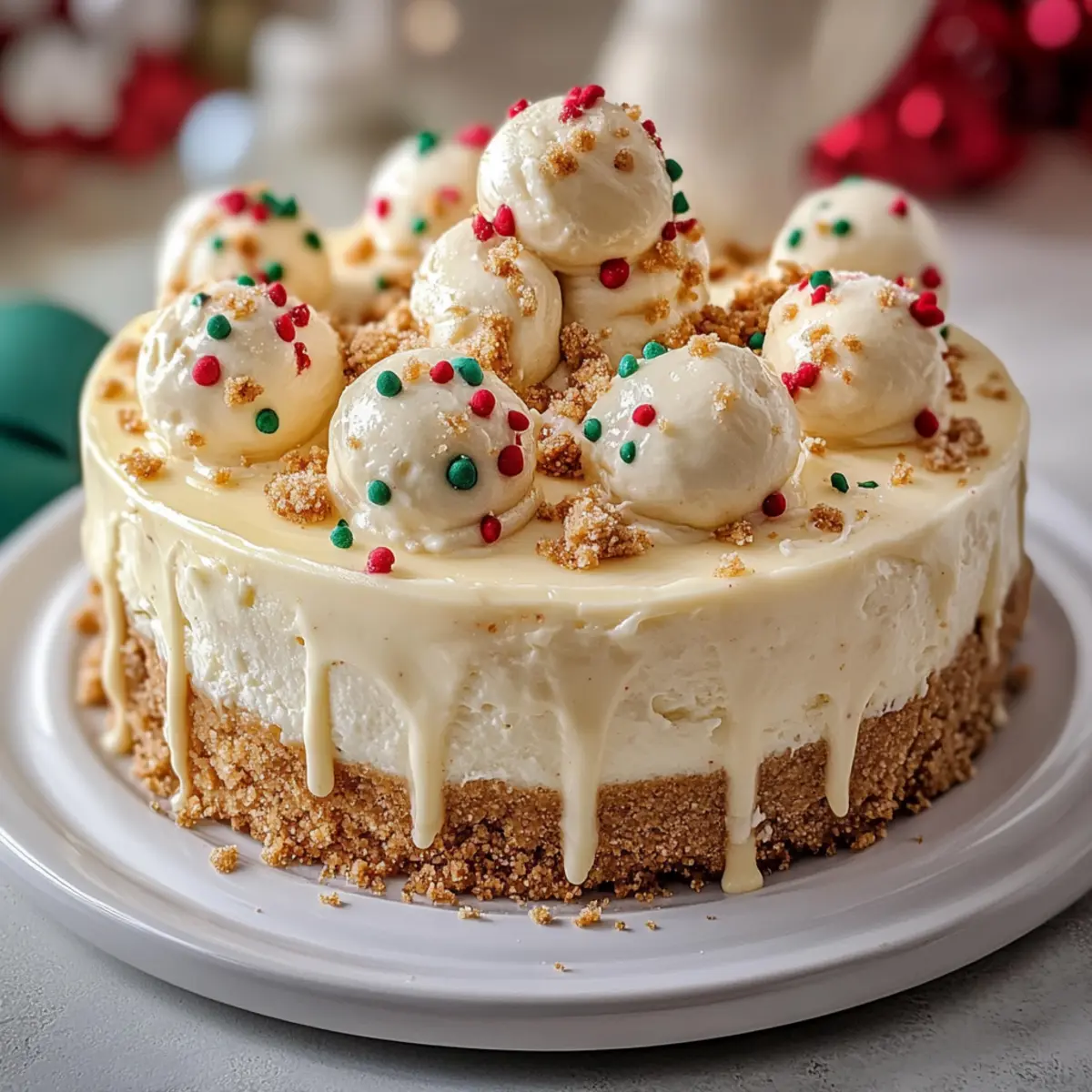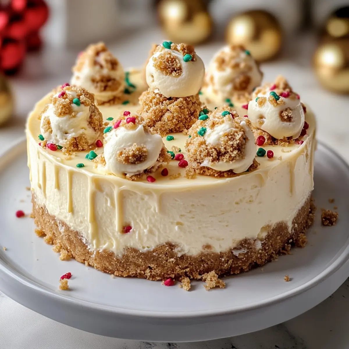 - To finish, generously drizzle the silky white chocolate ganache over the chilled cheesecake, allowing it to flow down the sides. For a festive touch, sprinkle additional Christmas sprinkles on top, and place decorative cookies around the edges. Slice into perfect pieces and get ready to indulge in your Sugar Cookie Cheesecake Deluxe!