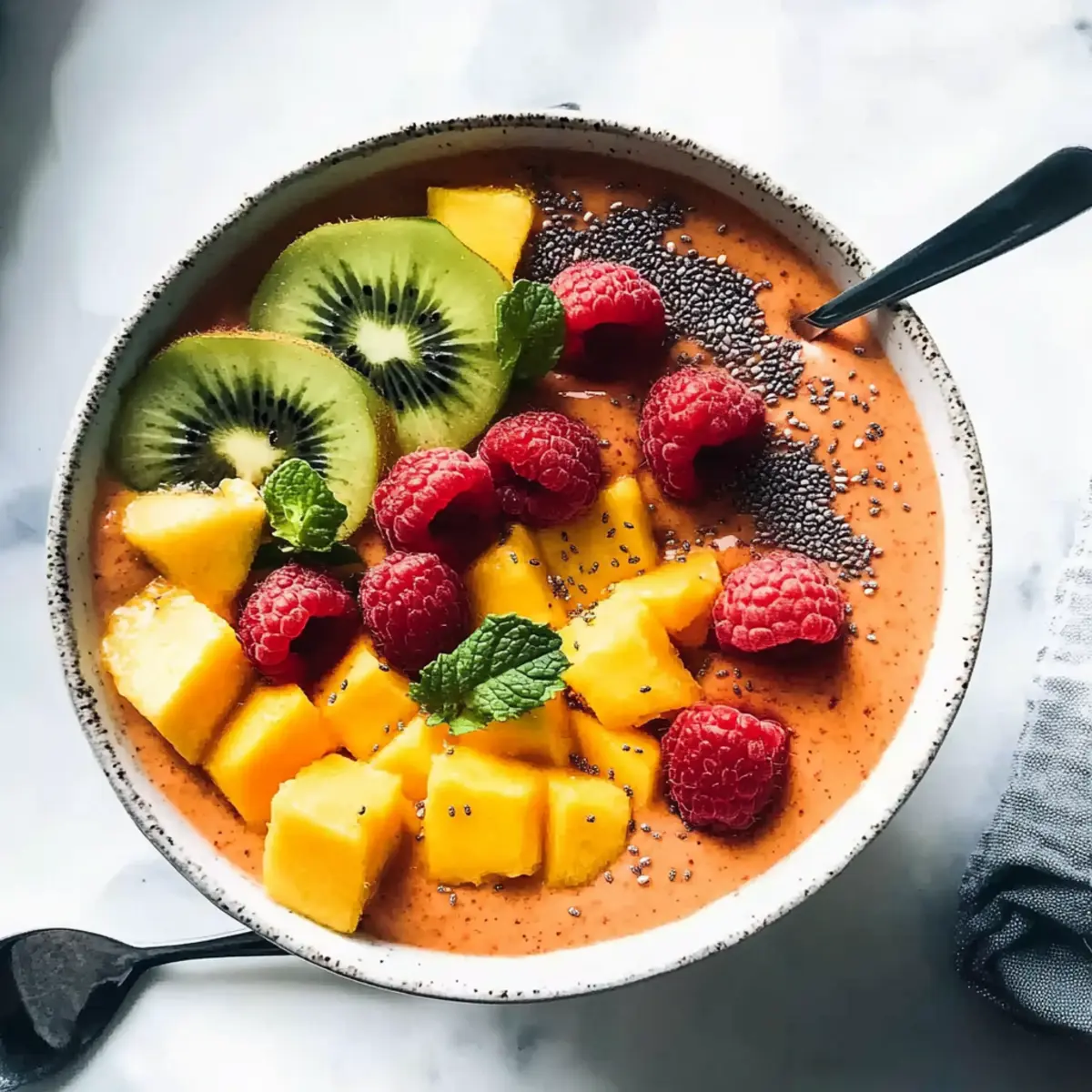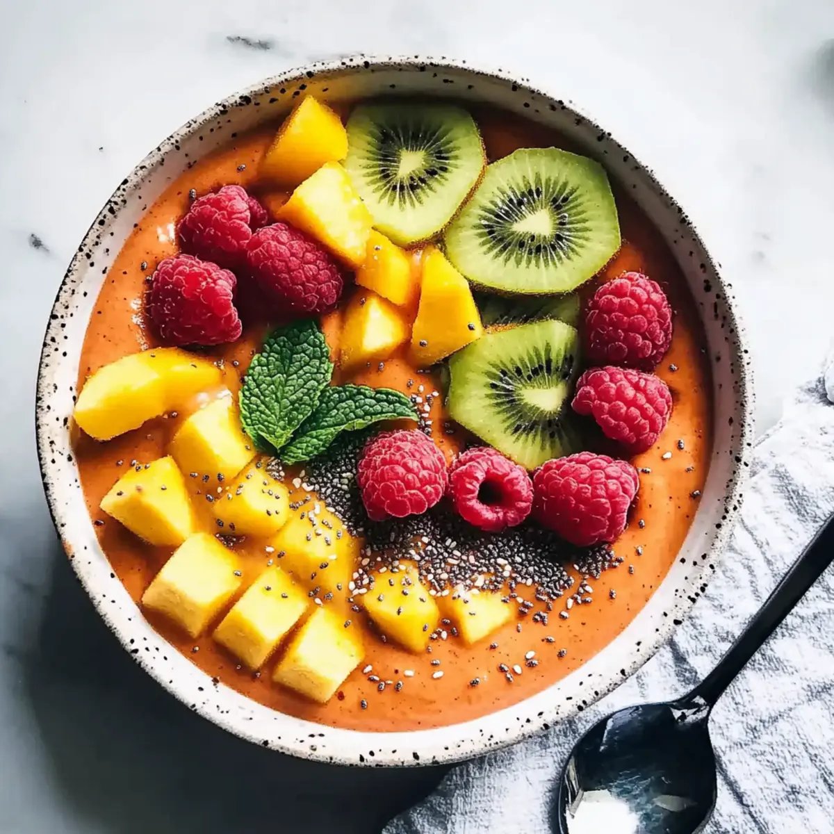Add diced fresh mango, a sprinkle of chia seeds, and fresh raspberries atop each bowl. Slice the kiwi and arrange it beautifully for an extra burst of color and flavor. Finally, finish off with fresh mint leaves to enhance the freshness. This delightful presentation instantly transforms your smoothie bowl into a nutritious work of art!