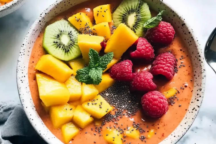 - Divide the smoothie mixture between two bowls, then add diced mango, chia seeds, and raspberries on top. Decorate with sliced kiwi and fresh mint leaves.