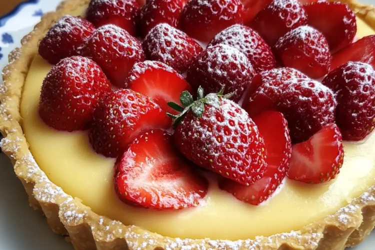 A delightful Vanilla Custard & Strawberry Tart combining velvety custard and vibrant strawberries, perfect for summer gatherings.